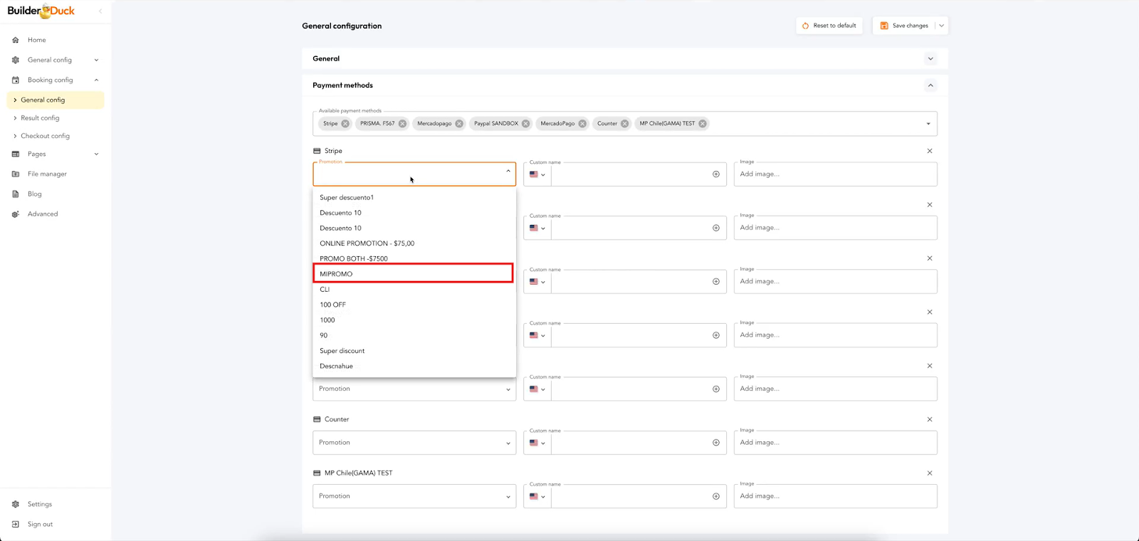 Na seção Métodos de pagamento, escolha um método de pagamento no menu suspenso para exibir os campos da promoção.