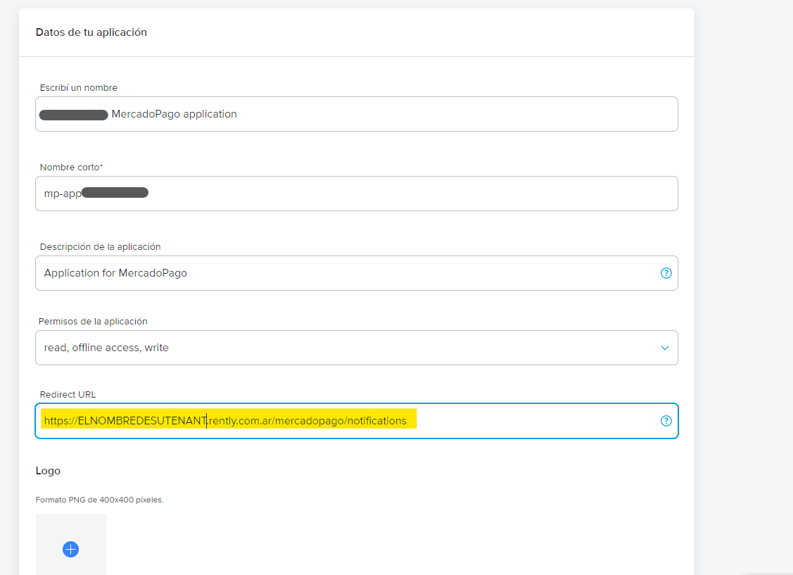 Adicione o seguinte link, substituindo a palavra TENANT pela URL que você usa para acessar o Rently: https://TENANT.rently.com.ar/mercadopago/notifications no campo "URL de redirecionamento".