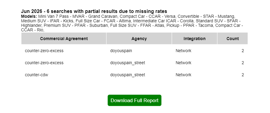 Este relatório mostra as datas em que as buscas estão sendo realizadas em sites ou corretoras, mas o cliente final não encontra disponibilidade. Isso pode acontecer porque realmente não há veículos disponíveis na categoria, porque as tarifas estão configuradas com um número mínimo de dias e o cliente está buscando períodos mais curtos, ou porque as tarifas ainda não foram configuradas para essas datas.