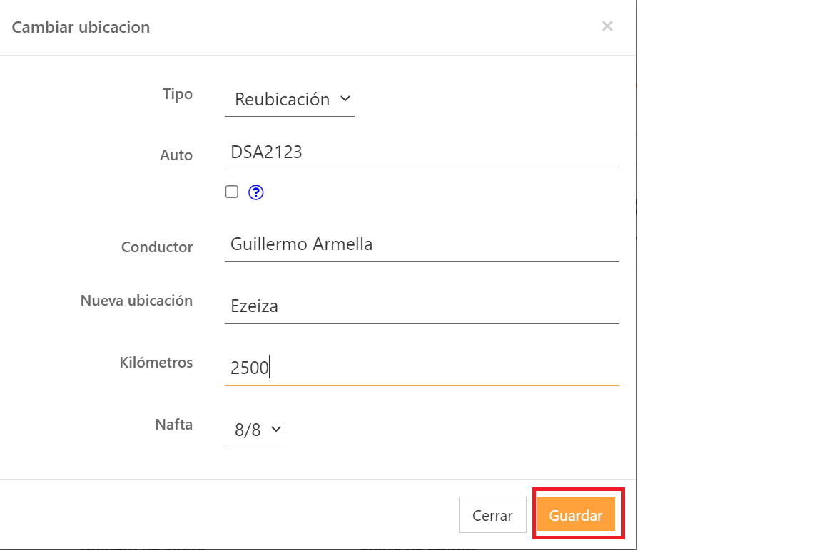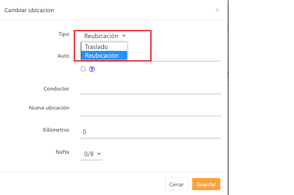 - Selecione "Relocação" e preencha os seguintes campos: "Veículo", "Motorista", "Novo Local", "Quilometragem" e "Combustível".