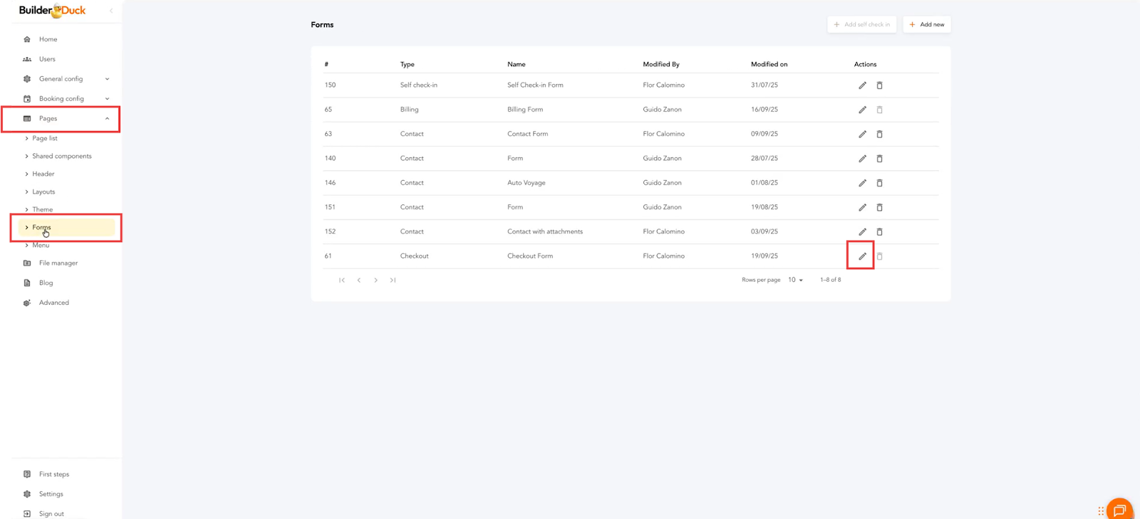 Para personalizar seu formulário de checkout, vá para Páginas e selecione Formulários. Lá, selecione o formulário de checkout e clique no ícone de edição.