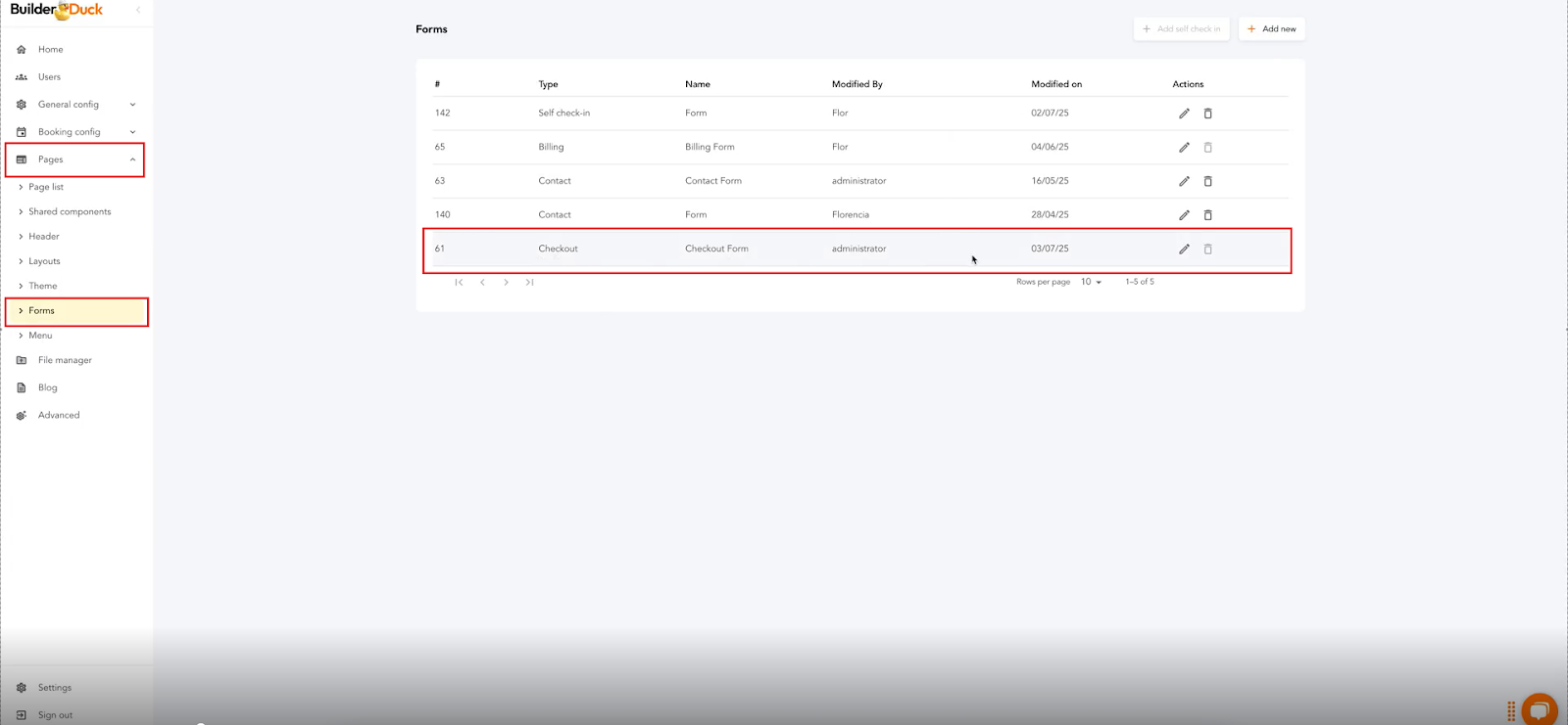 Para solicitar a foto do documento de identidade e/ou da carteira de motorista no formulário de finalização da compra, acesse Páginas na barra lateral e selecione Formulários. Em seguida, acesse o formulário de checkout.