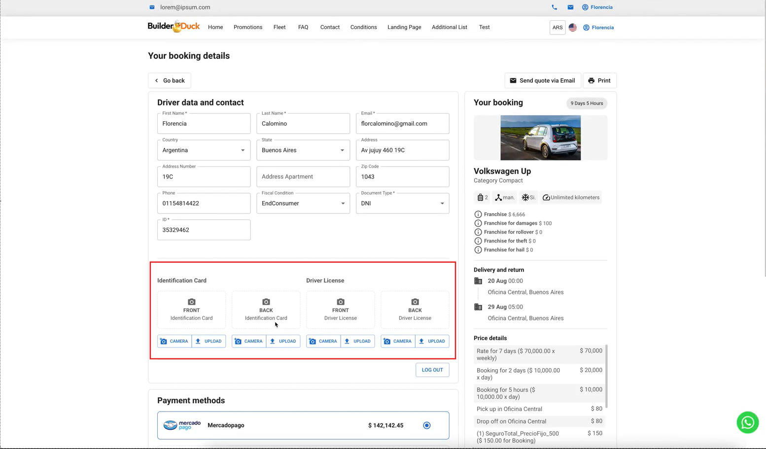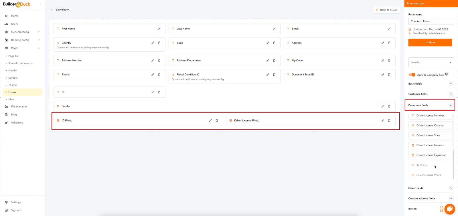 Com o BuilderDuck, você pode pedir aos seus clientes que anexem uma foto da frente e/ou do verso do documento de identidade e/ou da carteira de motorista ao formulário de reserva.