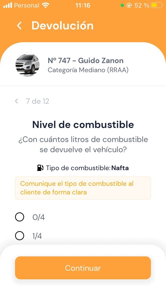 Esta etapa permite coletar informações sobre o nível de combustível do veículo no momento da entrega e da devolução.
