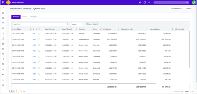 Se você tiver o módulo de liquidação de saldos ativo, poderá ver rapidamente quais empresas ainda possuem dívidas com a sua locadora.