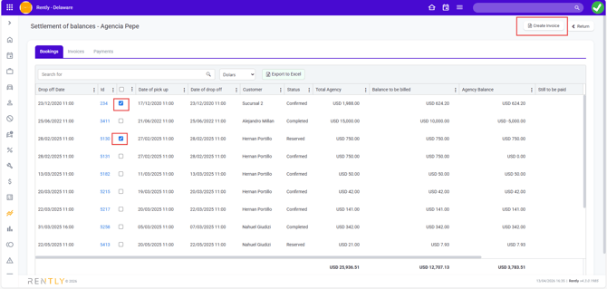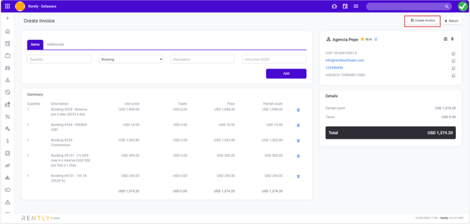 Você verá então os detalhes do saldo da agência. Verifique se todos os itens que deseja faturar estão incluídos. Caso queira remover algum, clique no ícone de lixeira. Uma vez selecionados todos os itens, clique em Criar fatura.