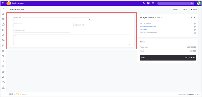 Em seguida, selecione o tipo de fatura, a condição de venda, a data de vencimento e a ordem de compra. Você também pode adicionar observações.