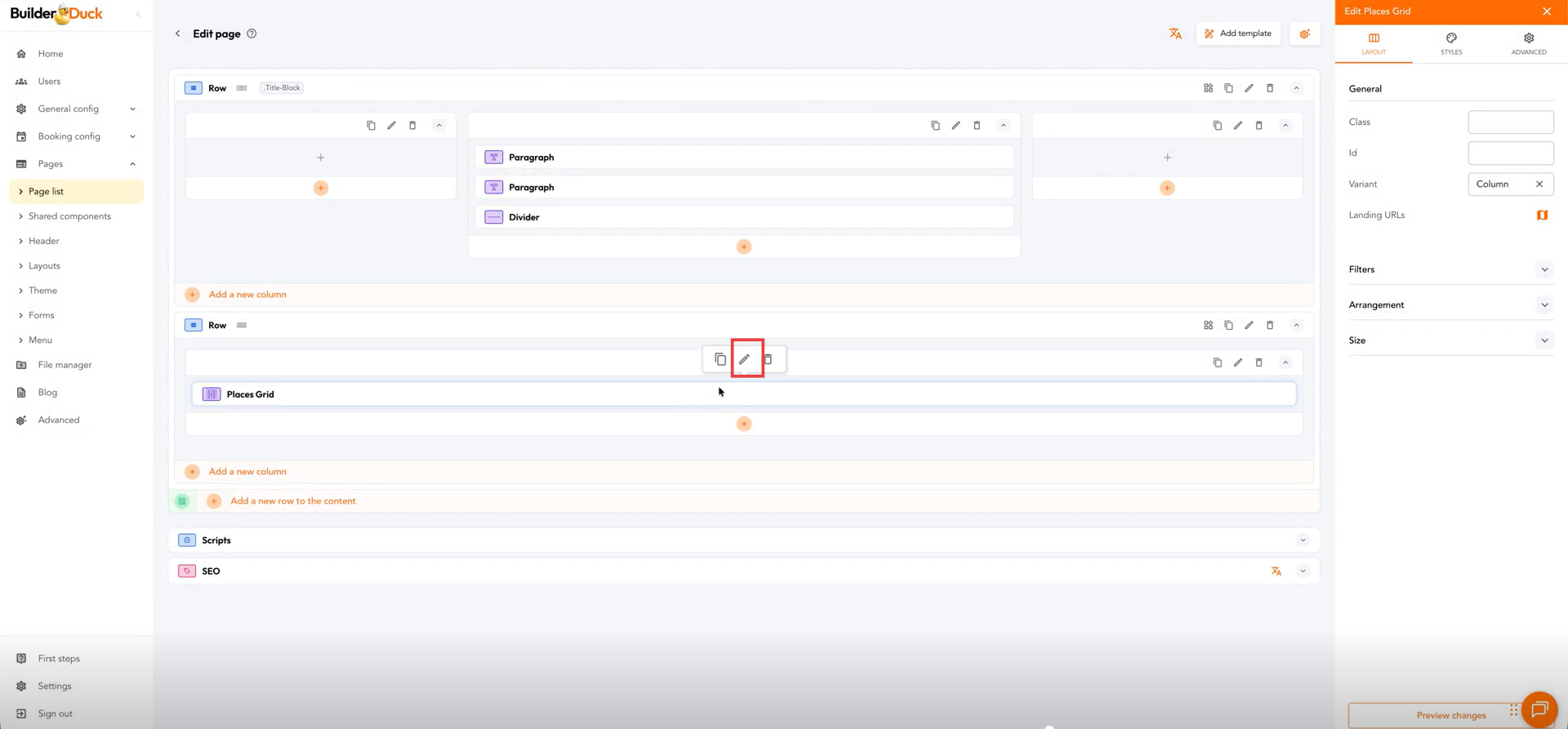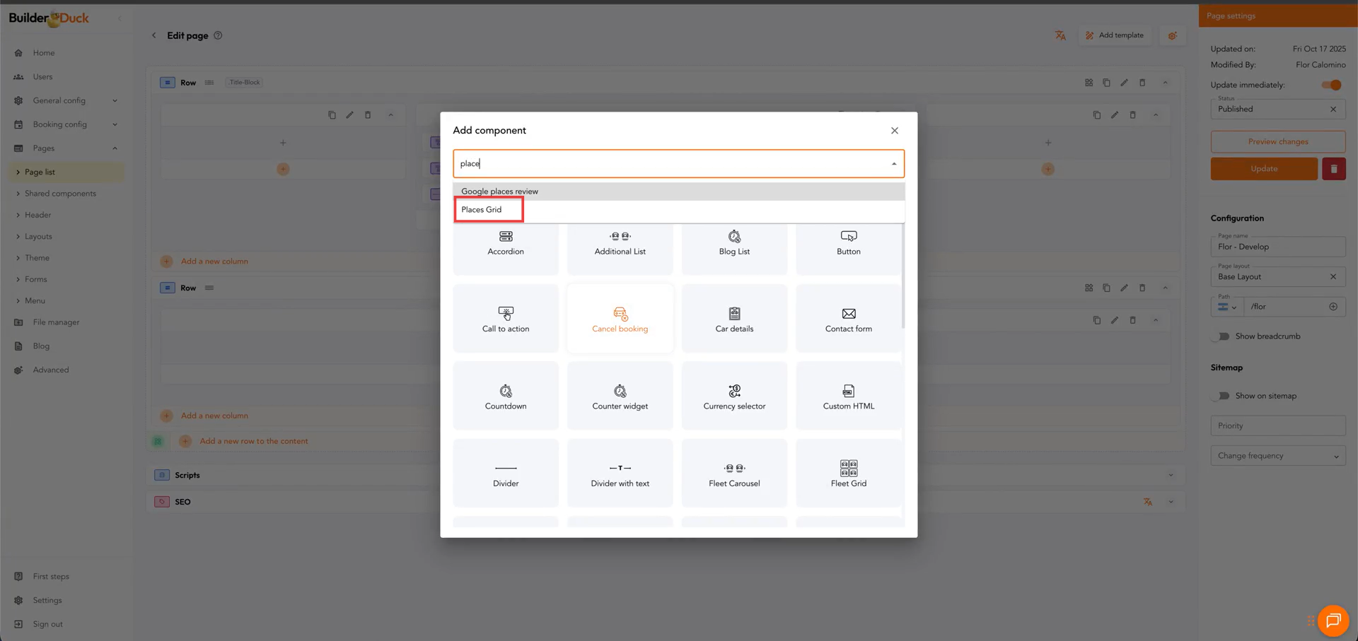 Veras la estructura del sitio con la información de tus sucursales creadas en RMS automáticamente pre-cargada. En el componente Cuadrícula de Sucursales (places grid) presiona el ícono de edición.