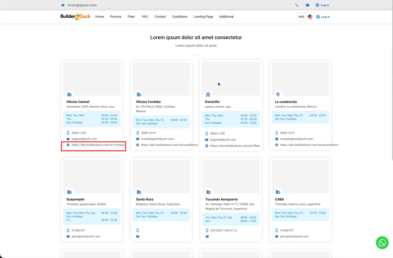 BuilderDuck sincroniza automáticamente los datos de tus sucursales desde RMS, permitiéndote mostrarlos en tu sitio web. También puedes agregar la landing de cada sucursal para incluirla en su tarjeta de información.